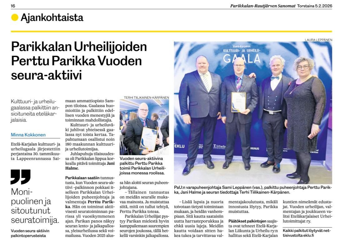 Etelä-Karjalan kulttuuri- ja urheilugaalaa vietettiin Lappeenrannassa perjantaina 30.1.2026 Saimaan ammattiopisto Sammossa. Parikkalan Urheilijoiden puheenjohtaja ja valmentaja Perttu Parikka palkittiin tilaisuudessa vuoden Seura-aktiivi -palkinnolla. Perusteluissa Etelä-Karjalan Likunta ja Urheilu (EKLU) toteaa: ”EKLU on päättänyt palkita sinut aktiivisesta, tuloksellisesta sekä sitoutuneesta työstäsi seurasi ja liikunnan hyväksi”.
